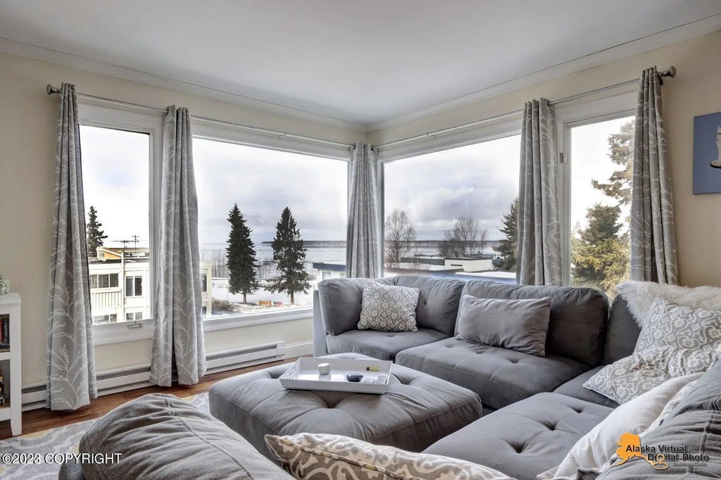 Gorgeous fully furnished corporate style located in the highly desirable Bootleggers Cove neighborhood. This condo has luxurious finishes with the most amazing inlet views being on the top floor of the building. Walking distance to all of Anchorages finest dining options and ample parks makes this property a wonderful place to live and play! Common area garage parking and ample street parking.