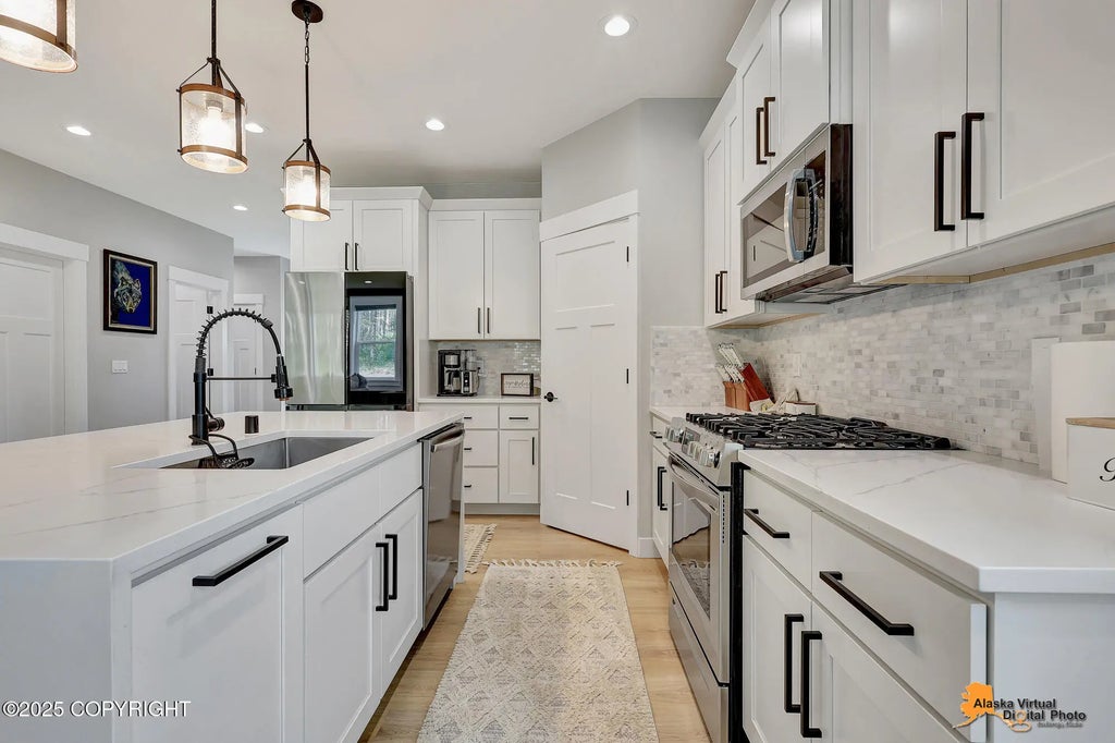 Better-Than-New Modern Farmhouse in Wasilla With 2,026 sq ft, 4 bedrooms, and 3 bathrooms, this one-year-young home delivers new-construction peace of mind plus the upgrades you don't have to plan or wait for. The heart of the home is a huge eat-in kitchen with a dramatic waterfall counter, generous storage and prep space, and sightlines to the great room for effortless everyday living and entertaining. The private primary suite features a spa-style bath and walk-in closet, while three additional bedrooms flex for guests, office, or hobbies. Outside, added landscaping creates instant curb appeal and a yard ready for summer evenings. An oversized 3-car garage fits trucks, toys, and gear with room to spare. Efficient systems, durable finishes, and a flowing layout make daily life simple. Skip the punch list and move right ineverything you wanted after closing is already done. Better than new, beautifully finished, and ready now.